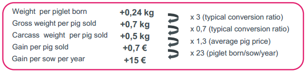 2. 斷奶體重改善240g/仔豬,導(dǎo)致投資回報(bào)率從20:1提升到40:1。最低的投資回報(bào)率:20/1!