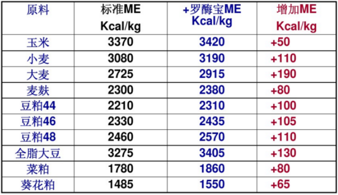表1:羅酶寶對主要原料代謝能的影響