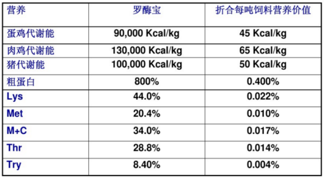 哺乳豬料 ME 3280 kcal/kg,配方成本2700元/噸,0.82元/Kcal;每噸料羅酶寶添加成本:50*0.5=25元;25元/0.82=30.5 kcal