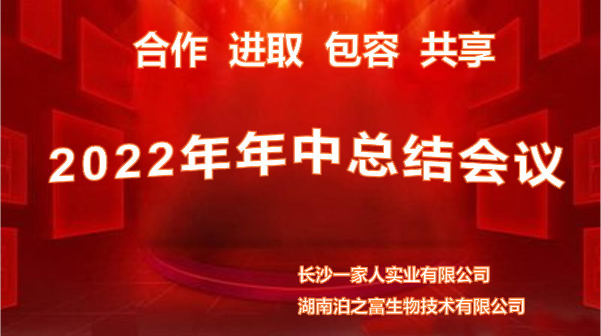 2022年7月28日至7月29日,由長(zhǎng)沙一家人實(shí)業(yè)公司承辦,湖南泊之富生物技術(shù)有限公司協(xié)辦,湖南惠益康、湖南宏德晟、湖南匯德源共同參加的年中會(huì)議在華晨雙帆國(guó)際1502室舉行。