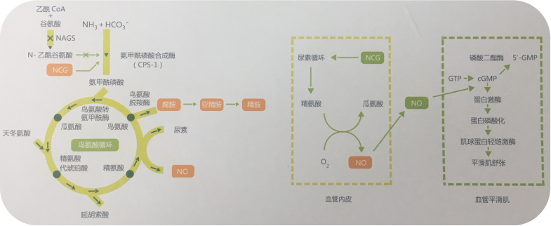注:動物體內(nèi)添加NCG,通過尿素循環(huán),促進內(nèi)源精氨酸合成與代謝,產(chǎn)生NO和多胺。NO可使血管平滑肥舒張,促進毛細血管生成,增加機體微循環(huán),提高多胎動物繁殖性能,促進幼齡動物的生長發(fā)育。